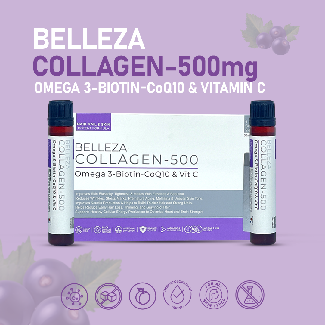 Belleza Collagen 500 with Omega 3, Biotin, CoQ10 & Vitamin C is a premium oral shot designed to support glowing skin, strong hair, healthy nails, and overall wellness. Its unique blend of collagen, essential vitamins, and antioxidants that provides daily nourishment.