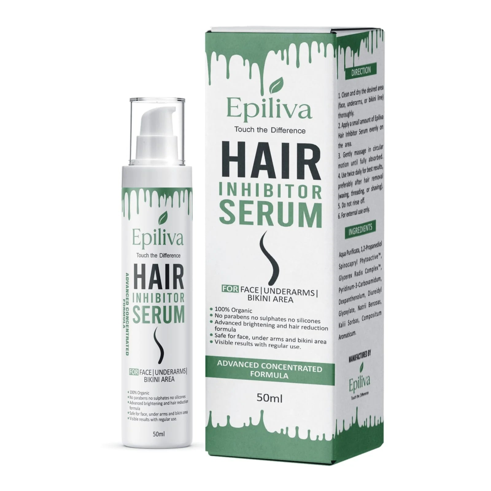 Discover the elegance of effortless beauty with Epiliva Hair Inhibitor Serum. Crafted with care, it works deep within to gently slow hair regrowth, leaving skin softer, smoother, and radiantly flawless. This skin-loving formula is designed for delicate areas such as face, underarms, and bikini ensuring comfort with every touch. With Epiliva, confidence isn’t just felt, it’s beautifully seen.
